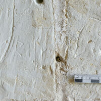 - Inscription gravée sur deux lignes avec un objet sans doute émoussé (sillon de gravure peu franc) d'une main quelque peu maladroit maitrisant bien l'écriture.