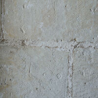 - Postérieurs à 1350 (datation du support). [Commentaire d'Aymeric Gaubert] Ces graffitis, au trait fin, représentent trois occurrences d’un objet indéterminé qui pourrait être une coiffe. Dans ce cas, il s’agirait plutôt du flocard, de forme tronconique, agrémenté d’un voile de soie au sommet, et qui pend plus ou moins longuement dans le dos (fig. 1). Ce voile pourrait être schématiquement suggéré ici par les torsades qui partent cependant de la base du cône et non de son sommet, à moins qu’il s’agisse de tresses. Cette coiffe féminine, portée par les femmes de l’aristocratie, fait son apparition dans les années 1420 pour disparaître à la fin du XVe siècle. Le « hennin » est un terme péjoratif qui désignait les hautes coiffes à corne (double ou simple), portées de la fin du XIVe siècle au début du XVe siècle, évoquant le diable cornu. Utiliser ce terme, qui viendrait en fait d’une injure, pour qualifier ces coiffes est donc impropre. Au Moyen Âge, hommes et femmes portent un couvre-chef à l’extérieur comme à l’intérieur.