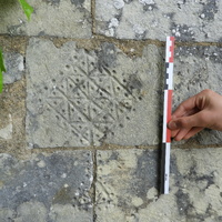 - Forme geométrique, probablement une croix chrétienne entourée de points, comblés de triangles de losanges de carrés et de points ou peut-être un objet liturgique comme un ostensoir