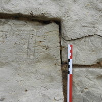- Extérieur, mur sud, base droit du décor de tore, orienté vers le nord, à la verticale, à 139 cm