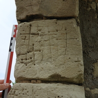 - Extérieur, mur sud, 1er claveau gauche (est) de la porte, face inférieur, orienté vers l'ouest, à la verticale, à 120 cm